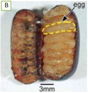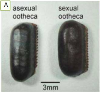 A)左邊是孤雌生殖產生的卵鞘,右邊是有性生殖產生的卵鞘;B)打開一個卵鞘裡面可以看到很多蟑螂的卵。